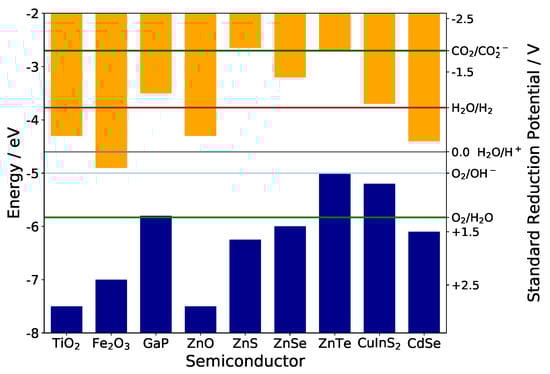 Band edge positions extracted from literature data [,,,] compared to Standard Reduction Potentials of some important redox couples.
