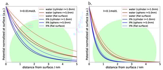 Potential screening at room temperature depending on geometry and nature of solvent (IPA: isopropyl alcohol) at (a) ionic strength of 0.01 mol/L (b) ionic strength of 0.1 mol/L.