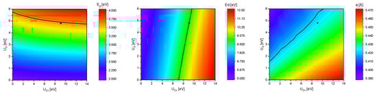 Trend of the band gap (left), the difference of the valence band maximum and the Zn 3d states (middle) and the lattice parameter a (right) with respect to the UZn and US parameter.