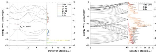 Band structure and orbital projected density of states of s-ZnS (left) and a 10,10 carbon nanotube (CNT) (right).