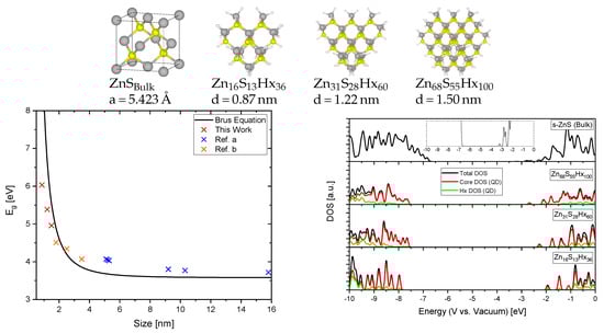 Figure 6 shows the relaxed structures for s-ZnS bulk and QDs (passivated with fictional hydrogen atoms Hx to saturate dangling bonds on the surface atoms) with different sizes, the corresponding density of states (DOS) aligned to absolute energetic positions with respect to the vacuum and the energy band gaps Eg obtained by modeling, experiment and by theoretical calculations using the effective mass approximation (EMA, Equation (4), Brus equation []). Although the limitations of the EMA are well-known [,] the mismatch between experimental values, calculations based on the EMA and our calculations based on ab-initio DFT are minor. That shows that the values for the Hubbard U parameters elaborated above are transferable and suitable for both bulk and cluster systems.