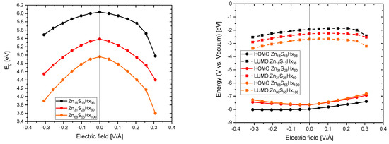 Absolute energetic position of the HOMOs and LUMOs for different sized QDs with Zn (left) or S (right) surface defects as a function of the applied electrical field.