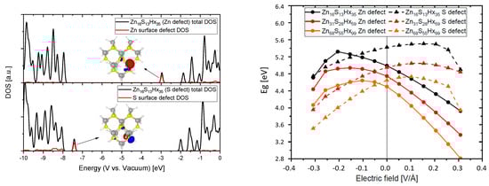 Density of states (DOS) and frontier orbitals of QDs with Zn and S surface defects (left) and the band gap of different sized QDs with surface defect states as a function of the applied electrical field (right).