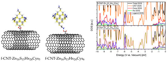 To research what influence the actual physical binding of the carbon support to the QD in nanocomposites exerts we investigated two different cases of a functionalized CNT (10,10) binding to a cysteamine terminated QD. The oxidized CNT was constructed by destroying two C-C bonds within a hexagon of the CNT structure. The resulting dangling bonds were saturated with oxygen and a hydroxyl group on one carbon atom to produce the carboxyl group and a hydrogen atom and a new covalent bond between two C atoms to form a pentagon to saturate the remaining dangling bonds []. The carboxyl group of the CNT is then considered to act as a passivating ligand itself in the first case and to bind electrostatically to the amine group of the cysteamine in the second case. The obtained relaxed structures and the corresponding DOS are illustrated in Figure 9. When the DOS of the functionalized CNT is compared to the pristine one (see Figure 5) it is observed that the oxidation and partial destruction of the CNT hexagonal structure leads to the loss of the metallic conducting character and the opening of a small band gap of Eg ∼ 0.7 eV. This is likely due to the hybridization of some carbon atoms from sp2 to sp3 which breaks the homogeneous delocalization of the -electrons []. More in focus of this work were the electronic states of the semiconductor QD. No significant change of the nanocrystal core DOS between the two binding possibilities can be seen. Note that no surface defects were present in these systems since all dangling bonds on S and Zn atoms are terminated by either fictitious hydrogen atoms or organic ligands. Nevertheless, when compared to our previous calculation where the QD was passivated with only fictitious hydrogen atoms (see Figure 6) a shift of the band edge (HOMO, from −8.0 eV to −7.3 eV vs. vacuum) along with states arising from the ligand molecules near this band edge is noticed. These results suggest that the actual electrostatic binding of the oxidized CNT to the QD has no particular impact on the electronic structure of the semiconductor nanocrystal although it seems that surface passivating ligands can very well exert an influence on these properties. Therefore, we also investigated how different ligands modify the electronic structure of the QDs and how pronounced such influences are.