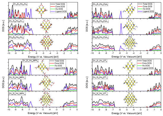 DOS of Zn16S13Hx24 QDs with different surface passivating ligands (yellow: S, white: H, black: C, red: O, blue: N).