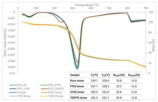 The analysis of first derivative of the TGA curves (DTG curves) allows distinguishing several characteristic stages of the process. The first stage in the range of 50–120 °C corresponded to the evaporation of water contained in the straw fibers. The greatest weight loss due to moisture removal was recorded for pure straw and PTES straw. This means that these materials were characterized by the highest hygroscopicity. The material treated with VTES and TESPTS showed a reduction in moisture content, possibly due to a reduction in the number of hydroxyl groups after silanization [29]. Besides, the lower water content in the silane-treated straws could be related to the penetration of silane into the cell wall of the lignocellulosic material through the pores and its deposition in the interfibrillar area, consequently creating a barrier preventing water penetration into the straw [30].