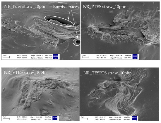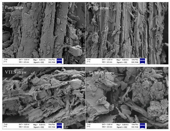 In order to investigate the effect of the performed silanization on the structure of the fillers, SEM images of untreated and treated straw with PTES, VTES, and TESPTS (Figure 3) were prepared.