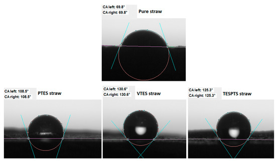 The analysis of the water wettability of the unmodified and modified straw fibers was carried out in order to evaluate the activity of the silanes used. The nature of the surface was investigated on the basis of the contact angle measurements (Figure 4).