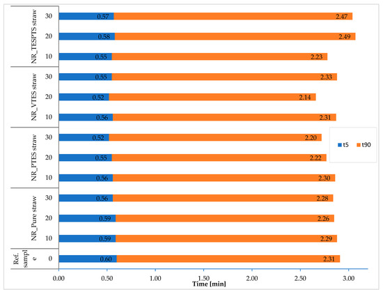 Rheometric properties of natural rubber composites filed with: -pure straw (NR_Pure straw); -straw modified with propyltriethoxysilane (NR_PTES straw); -straw modified with vinyltriethoxysilane (NR_VTES straw); -straw modified with 3,3′-Tetrathiobis(propyl-triethoxysilane) (NR_TESPTS straw).