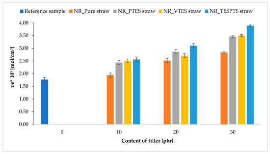 The highest cross-linking density was characteristic for composites containing straw treated with TESPTS and slightly lower with VTES and PTES. This dependence can be explained by the different activities of the silanes used in the vulcanization process. This activity resulted from the presence of groups in the silanes that could have a different effect on the cross-linking of natural rubber. PTES does not contain groups that can actively participate in vulcanization, but nevertheless increases the hydrophobicity of the surface, and thus obtains better compatibility with natural rubber. As a result, the cross-linking density value for the NR_PTES straw composites was slightly higher than the NR_Pure straw systems and the reference sample. The vinyl double bond present in VTES is considered a vulcanization reactive site that can create additional network nodes. On the other hand, the TESPTS silane has sulfur atoms in its structure, through which cross-links, so-called sulfur bridges, between sections of the polymer chain are built. The reactive groups present on the modified straw particles could create additional connections in the spatial structure of the composite, affecting the effective number of connections formed as a result of vulcanization.