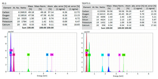 The study showed that, in the TESPTS samples, apart from carbon (the quantitative value may be overestimated because of the pre-treatment with carbon before the test), oxygen, silicon, potassium, and calcium atoms also contained sulfur.