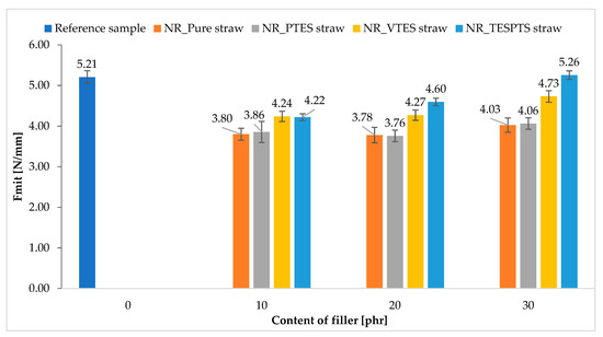 Nevertheless, the applied modifications with silanes significantly (even up to 30%) increased the strength of these materials. In general, the Fmit value increased as the filler content in the elastomer increased. The strongest influence of the modifiers was observed for the TESPTS and VTES modified vulcanizates. Improvement in the tear strength of composites may result from increased adhesion of fibers to the polymer, and thus stronger interfacial interactions influencing the increase in cross-linking density. The obtained results confirmed the previous research results and showed the highest activity of TESPTS and VTES as modifiers of straw used to reinforce natural rubber.