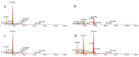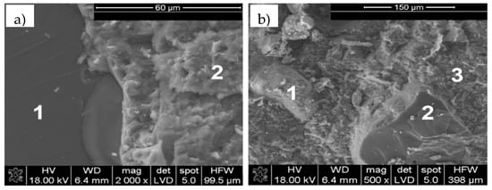 The results of the microstructure tests of the concrete samples—as obtained by scanning microscopy and X-ray microanalysis after 28 days of maturation—are presented in Figure 1 and Figure 2, respectively. Observations of the RPC microstructure showed primarily the presence of the compacted C–S–H phase (point 2 in Figure 1a, points 1 and 3 in Figure 1b, X-ray analysis in Figure 2b,d), which is responsible for the concrete’s high strength and durability. It is formed as a result of the reaction of calcium ions with silica fume during the cement’s hydration, and it adheres very closely to quartz particles (point 1 in Figure 1a, point 2 in Figure 1b, X-ray microanalysis in Figure 2a,c).