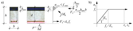 (a) Distribution of stresses and their resultants for the assumed ultimate limit state under bending in the reinforced concrete beam strengthened with the RPC layer in the compression zone ( is the position of neutral axis as its distance [m] from the beam’s compression face equal the height of RPC layer in the limit state). (b) Assumed stress–strain relation in the reinforcing steel (based on [41]).