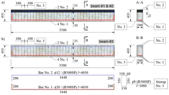 Side view, cross-section and reinforcement: (a) beams strengthened with the RPC layer, (b) reference beam (dimensions in mm).