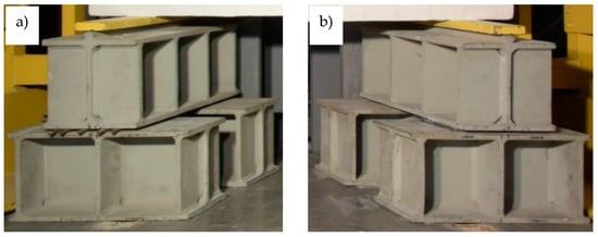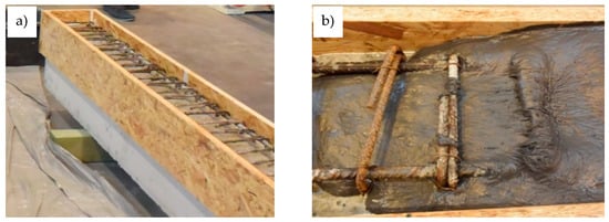 In the first stage of making the elements for testing, reinforcement baskets were made and placed in the formwork prepared in the concrete plant. In the case of two beams, markers indicating the level of the OC filling were placed 7 cm from the top edge of the formwork. After the OC was poured, the beams were wet cured for 28 days, after which the formwork was dismantled, and the elements were transported to the Structural Engineering Laboratory of Opole University of Technology, where they were stored for 2 months. The temperature in the laboratory was 21 °C ± 2 °C, and the relative humidity was 60% ± 10% before the period of testing. After this period, another formwork for the upper layers of the RPC with a thickness of 7 cm (Figure 7a) was made. Then, the RPC was prepared using a laboratory mixer with a 50 L rotary bowl. Prior to pouring the RPC topping layer, the upper surface of the OC layer was moistened in order to limit the transport of water from the fresh RPC mixture into the OC layer, in order to prevent the excessive drying of the RPC mixture at the layer boundary and to ensure appropriate conditions for bonding. Due to the fact that the designed RPC mixture had a good workability, there was no need for the mechanical compaction of the layer to remove air pockets (Figure 7b). After the RPC hardened, its upper surface was moistened every few days for a month, and in the meantime, it was protected with PVC film. In the next stage, the testing of the beams was started, which is described in detail in the following chapter.