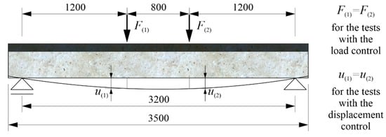 The discussed research examples show how important it is to skilfully combine two layers of concrete with extremely different properties in a structural element. For the authors of this paper, it was, among other things, a contribution to performing their own research in this area. It was focused on the search for a way to combine OC and RPC layers, and their arrangement together with reinforcing bars in the beam cross-section, which will enable the economical and effective use of RPC, so that the process of overloading the element is at the same time clearly visually signaled by cracks on the tension face of the element. Of course, the latter is possible in a situation where the longitudinal tension reinforcement is yielded before the concrete is crushed in the compressed part. It is also the classic preferred way of destroying beam structures for safety reasons in reinforced concrete mechanics if they are overloaded (e.g., [40]). In addition, with today’s typical use of high-ductility steel (class C according to EN 1992-1-1 [41]), such a destruction mechanism will naturally allow for high energy absorption in the post-critical state, and the full utilisation of the potential of the reinforcing steel while using an RPC with very high compressive strength in the compressed beam’s part. Therefore, on the basis of the literature review (e.g., [9,19]), the use of simply supported OC beam strengthened with an RPC layer on its bottom tension face was abandoned, and it was applied only in the top layer. In addition, due to the possibility that a relatively thin layer of RPC may be delaminated as a result of the development of cracking and the premature destruction of the compression layer, a stirrup connection was applied along the entire length of the beam.