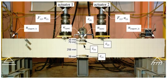 The measurements of the selected quantities were carried out in the same way on each of the beams. For example, Figure 10 shows beam #1 after the installation of the measurement devices. The following were measured: the loads from the actuators ( and ); the deflections at the point of load application ( and ), the deflections at the middle of the span () and the axis of the supports ( and ); the normal strains along the beam axis at the middle of span on the upper surface of the beam (), at the level of the longitudinal upper rebars (), 10.5 cm from the upper surface (), and at the level of the longitudinal lower rebars (); and the curvature of the upper beam surface at the middle of the span (). The symbols of these quantities are given in the parentheses. These symbols are also shown illustratively in Figure 10 at the relevant devices and sensors that measured them.
