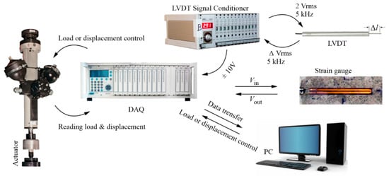 All of the displacement measurements (except for the travel positions of the actuators, which were measured using sensors built in by their manufacturer) were performed using linear variable differential transformers (LVDTs; Pelltron PT×30) connected to the Pelltron MPL512 conditioner, which allowed us to generate an alternating voltage (in the range ±10 V) of a frequency of 5 kHz, and to read out the voltage differences as a result of the change in the position of the transducer core relative to the coils. The curvature was indirectly determined by means of the LVDT placed in a specially prepared device measuring the difference in the deflection of the upper beam surface along the section between the device supports (placed at a distance of 400 mm from each other) and the center of its span [54]. Then, using the equation of the circle inscribed in the line of the locally measured deflection along the section, the curvature of the beam’s axis at the middle of its span was approximated [54]. Before starting the measurements, each of the LVDTs’ measurement chains was calibrated separately, with an accuracy of 0.001 mm in the measured displacements. All of the sensor data listed above was recorded with frequency 20 Hz using the HBM MGCplus data acquisition system, a computer, and the Catman software. The configuration of the measurement chains is illustrated in Figure 12.