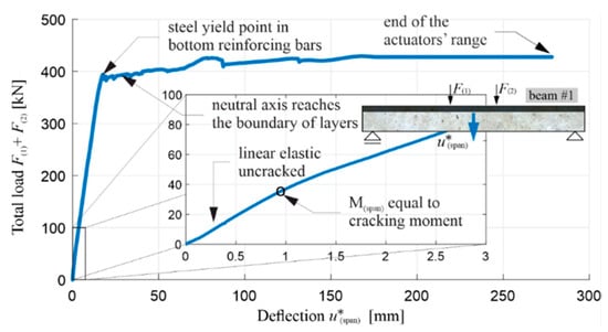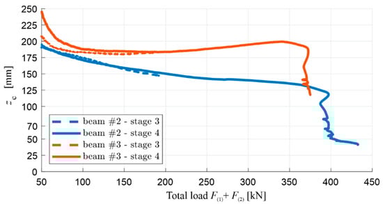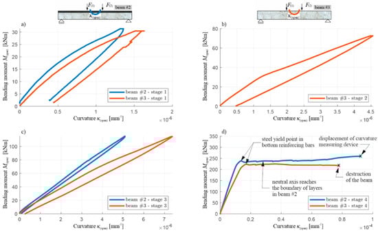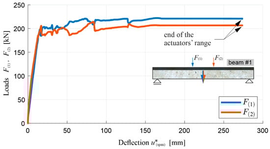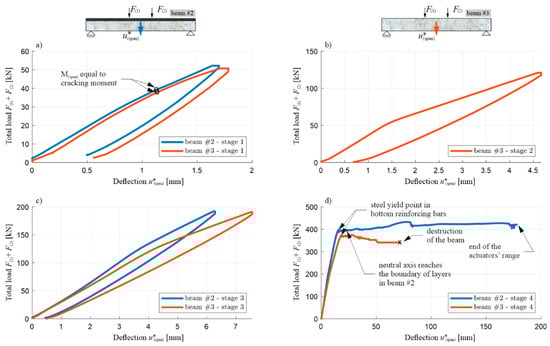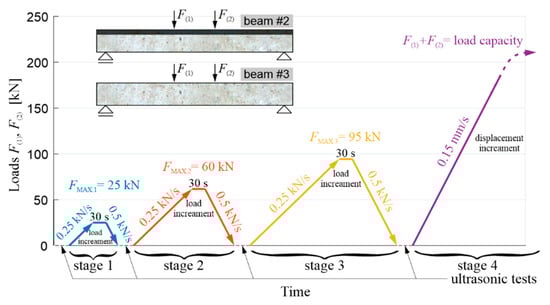 First of all, the load-bearing capacity of the beam with the RPC strengthening was determined experimentally, verifying the correctness of the initial assumptions made. Beam #1 was loaded in one stage. The load was applied by controlling the displacement of the actuators’ pistons, which was increased at a constant speed of 0.15 mm/s. It was determined that the beginning of the yielding of the lower main reinforcement was achieved with a bending moment of about 236 kNm (i.e., with an average load of about 197 kN per actuator). Thus, the load-bearing capacity was about 10% higher than expected. Based on Equation (6), it can be concluded that this is primarily the effect of the increased actual yield point of the reinforcing steel in relation to the value minimally declared by the manufacturer. Based on this result, a cyclic load course was assumed in the comparative tests of beam #2, with the RPC layer, and reference beam #3, where the maximum load in a given cycle was increased from stage to stage. Three stages were adopted, with a maximum load of 25 kN, 60 kN, 95 kN per the actuator in the sequence and in the fourth last stage until the beam was destroyed (or the maximum safe travel range of the actuators’ pistons was reached). The first three load levels thus corresponded to approximately 12.5%, 30%, and 50% of the load-bearing capacity of the RPC-strengthened beam, respectively. The load application course is shown in Figure 13. In stages 1–3, the load was applied by controlling the force (increase at 0.25 kN/s and decrease at 0.5 kN/s), with the maximum load in a given cycle being maintained for 30 s, and decrease continued until the load was fully released. In the last stage, the load was applied by controlling the displacement of the actuators’ pistons, which was increased, as in the case of beam #1, at a constant speed of 0.15 mm/s. As mentioned in Section 1, this procedure was implemented in order to technically enable the ultrasonic testing between the different load stages (Figure 13).