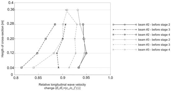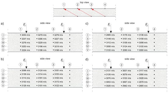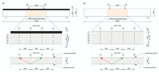 where and are the dynamic modulus of elasticity [Pa] of the material in an undamaged and damaged state, respectively; and and are the longitudinal wave velocities [m/s] in the undamaged and damaged material, respectively. To apply Equation (8) directly, must be measured in the element damaged at the same level throughout its volume, e.g., under pure tension. In an RC beam under pure bending conditions, with the progress of the elastic degradation of the concrete, changes along the height, so Equation (8) can be used with the following simplifications: it is assumed that the state of deformation in the beam can be described by means of the hypothesis of the maintenance of the planarity of its cross-sections (as in the Bernoulli–Euler beam theory); the wave velocities are measured in the horizontal planes of the beam and, in their case, the relative change of Young’s modulus is estimated; and the influence of uneven distribution along the cross-section height on the curvature of the fastest propagation paths is negligible. Furthermore, the presence of the reinforcement causes the determined value of the relationship to be disturbed for this reason [56], which dictates the necessity to carry out the measurements, as far as possible, not along the longitudinal rebars or stirrup legs. In the case of bending, this makes the results obtained from Equation (8) approximate but useful in estimating the progress of the elastic concrete degradation. In order to be able to use Equation (8) to estimate the development of brittle beam damage, measurements were carried out in the middle section of the beam with a constant bending moment, and a system of sending and receiving points was used as in Figure 14.