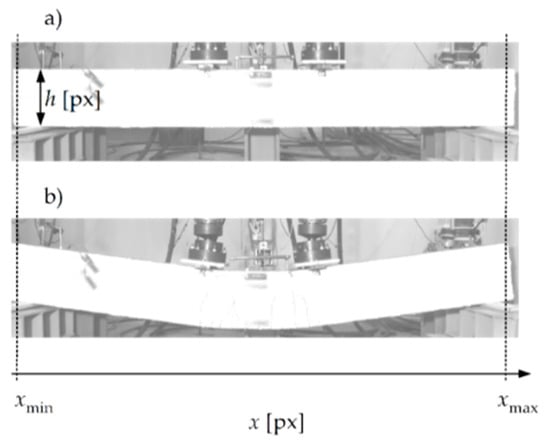 In the first stage, the area containing the side surface of the beam had to be determined automatically in the photos. At the beginning, the proposed algorithm requires the user to enter only three numbers: , , and . These numbers are obtained by analysing two photos from the registered series: the first photo, with the beam’s zero deflection (Figure 16a), and the last photo, with its maximum deflection (Figure 16b). The height of the beam, , is indicated in pixels in the first photo, whereas and are determined from the simultaneous analysis of both photos, also in pixels (Figure 16). They express, respectively, the minimum and maximum horizontal coordinates of the vertical line, which simultaneously passes through the upper and lower edge of beam in both images.