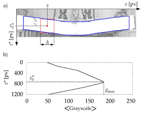 On this basis, the pixels lying at the middle of the beams’ height along their length were found in the photographs. For this purpose, for each of the range , a pixel was found with the vertical coordinate , for which the mean value of brightness calculated in the square with center and side was the highest. Therefore, for a given , all of the points in the range ) were considered to be the surface of the beam. The way in which this part of the algorithm works is illustrated in Figure 18.