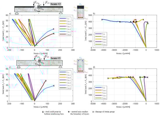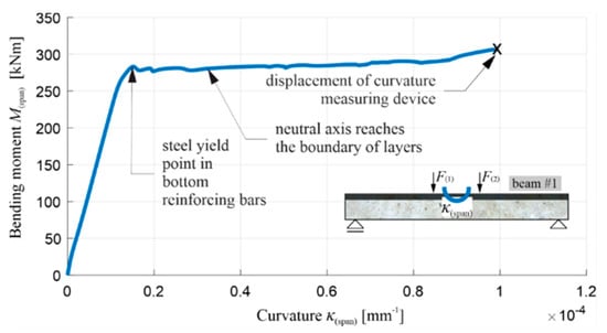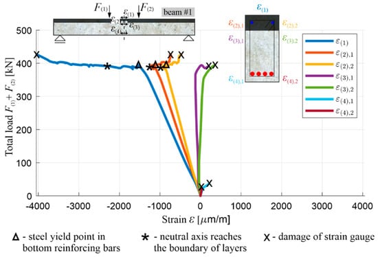 where is the normal strain [-] in the steel reinforcing bars at the moment of reaching the limit state; is the normal strain [-] in the concrete at the compression face of beam at the moment of reaching the limit state; and is the modulus of the elasticity [Pa] of the RPC. In the work, in the tested beams with the RPC layers was estimated using the strain measurements presented in Chapters 4–5.