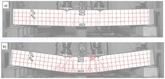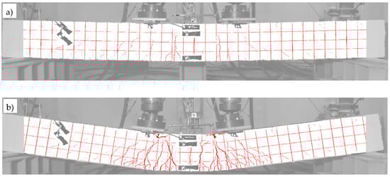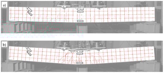 During the process of the loading of the beams, photographs of the beams were taken with a NIKON 1 v3 digital camera (resolution: 18 megapixels) at regular intervals (every 2 s) to archive the development of cracks. The obtained photos were subjected to photogrammetric analysis using an original computer program in C++, where algorithms were proposed in order to minimise user participation and automate the detection of cracks in the photos. The basis for the photogrammetric measurements proposed in the paper was the assumption of a significant difference in brightness recorded in the photo between the cracks on the surface of the beam and the surface of the beam itself. Before starting the loading, in order to enhance this difference and to equalize the brightness of the side surfaces of the beams, they were covered with a thin layer of white gypsum plaster (except for the strain gauges), which was then polished, and the beam was illuminated with a spot light source. Additionally, a positioning square grid with a 10 cm step (Figure 10 and Figure 15) was applied to facilitate the tracking of the brittle beam damage during the loading.
