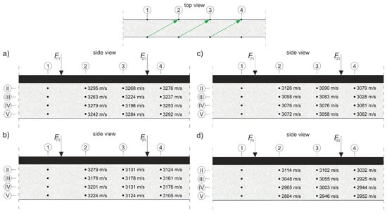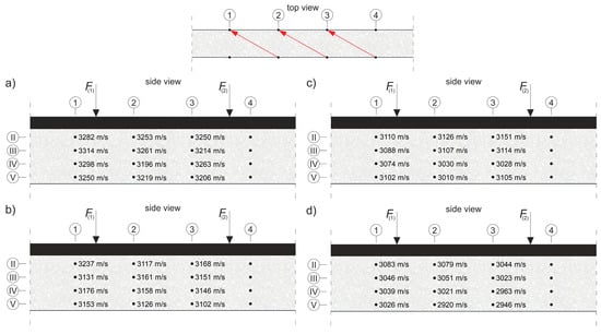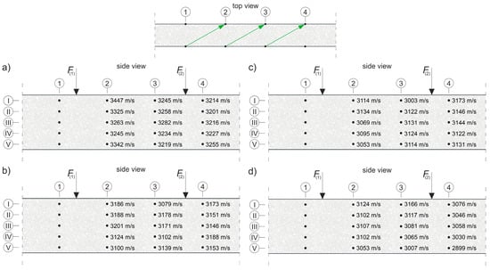 The tests were carried out four times on beam #2 and #3 before each stage of beam loading (Figure 13). The time of the longitudinal wave propagation was measured using the ultrasonic pulse velocity instrument Punditlab between pairs of the sending and receiving points situated in horizontal planes, with an offset of one point diagonally to another (Figure 14). The 54 kHz transducers were used, which were selected to meet the basic requirements of ASTM [60] concerning the possibility of longitudinal wave generation, i.e., that five times the dominant wavelength is not greater than the transverse dimension of the element, and that the wavelength is not less than three times the average diameter of the aggregate particles. The measured average velocities for all of the stages were in the range 2804–3447 m/s (see Section 5.2 for details), which allowed us to meet these requirements. Five rows (No. I-V) with five sending and receiving points were used for beam #3, and four horizontal rows (No. II-V) with the same number of sending and receiving points per row were used for beam #2 with RPC strengthening (Figure 14). In beam #2, the use of the upper raw (No. I) in the RPC layer was abandoned due to the fact that the generation of the longitudinal waves in the 7 cm layer required the use of much higher frequency heads, but it was impossible to receive them effectively because of the increased damping caused by the steel fibres.