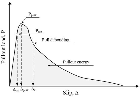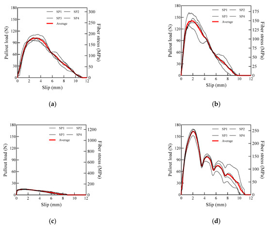 Table 3 shows the peak pullout load (Ppeak), fiber stress (σf), slip at peak load (Δpeak), and pullout energy (EP) values obtained for the samples. The values of Ppeak, Δpeak, and EP were determined from the load versus slip curves, as can be seen in Figure 1, while σf was calculated using Equation (6).