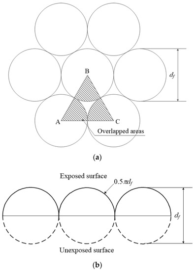Because the exposed surface of the bundled fiber is composed of a semicircle, as shown in Figure 2b, the ratio of the circumference of a semicircle (0.5πdf) to its diameter (df) represents the bundle surface roughness. Therefore, the exposed perimeter of a bundled fiber (pexposed) is given by Equation (5).
