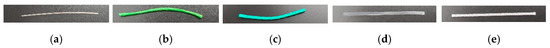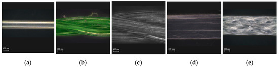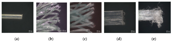 Surfaces of the macro-fibers before the pullout testing: (a) WFN1; (b) WFN2; (c) WFN3; (d) CP1; (e) CP2 [22].
