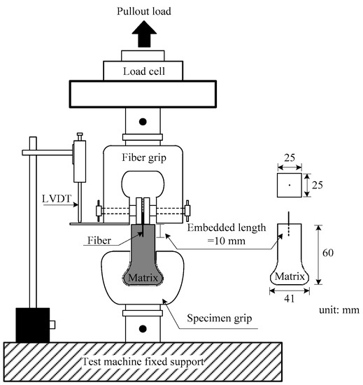 A universal testing machine with a capacity of 5 kN was used for the single-fiber pullout tests, which were performed at a displacement rate of 1 mm/min. During the pullout test, the load was measured by the load cell located above the loading frame, while the slip was measured using a linear variable differential transformer (LVDT), as shown in Figure 4. The data frequencies of both the load cell and the LVDT were 5 Hz. The surface of the fibers could be checked by analyzing images taken by stereoscopic microscope (HVM0850; Huvitz, Gyeonggi-do Province, Korea) with a Huvitz Lusis HC30-MU camera (Huvitz, Gyeonggi-do Province, Korea). In this study, a magnification of 2.0× was used with an LED light on the stage plate.