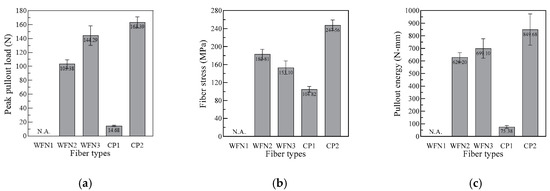 Figure 5 shows the pullout load versus slip curves of the WFN and CP fibers. The smooth-surfaced WFN1 could not be firmly gripped for the pullout load to be applied; therefore, results were not available (N.A.) for these specimens, and the WFN1 fibers were easily debonded from the mortar. These results agreed with those of Park et al. [22], who reported that WFN fibers with smooth geometry (WFN1 in this study) did not enhance the tensile strength of cement-based materials.