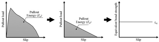 The bond strength between the WFN fiber and mortar could be obtained using the parameters of fiber geometry, and the results are provided in Table 5. Two interfacial bond strengths were calculated using Equations (7) and (8) to quantitatively compare the resistance of the WFN and synthetic fibers to pulling out from the mortar. The peak bond strength (τpeak) was based on Ppeak and was the maximum bond strength during fiber pullout. The equivalent bond strength (τeq) was based on the Ep and was derived assuming the bond strength remains constant over the entire embedment length, as shown in Figure 7 [35].