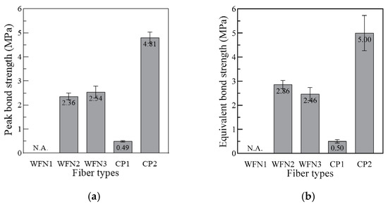 As shown in Figure 6c, the total energy required for fiber pullout from the matrix, EP, of WFN2, WFN3, CP1, and CP2 was 628.19, 699.09, 75.38, and 849.68 N mm, respectively. Similar to Ppeak, EP was also affected by the fiber geometry. Although there have not been reports on pullout resistance of recycled WFN fibers embedded in cement mortar, the results of previous studies have shown that the tensile strength or flexural strength of the bundled WFN FRCCs is not reduced compared to that of CP FRCCs [22,34]. Therefore, an evaluation of the pure bond strength between the fiber and the mortar, excluding the effect of the fiber geometry, was performed.