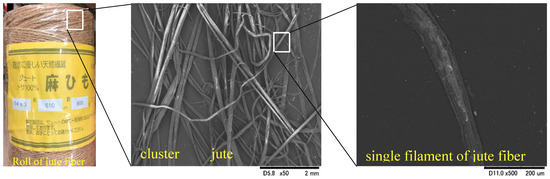 Previous research studies have indicated that jute fibers of appropriate length and content can substantially increase a soil’s engineering properties, and adding fibrous material can contribute to a significant reduction in construction costs [14,15] by improving the engineering properties of treated samples. Moreover, jute fibers have a high initial modulus, high consistency in terms of tenacity and tensile strength, high rigidity, and a lower percentage of elongation during breakage, leading to their wide use in soil improvement. The properties of jube fibers, as well as their availability, cost, and environmental friendliness, were the motivation for using jute fibers in this study. Locally available jute fibers (100% natural) were used in this study (Figure 1) without any chemical treatment. The jute fibers were purchased from DCM Homac Co., Ltd., Sapporo, Japan, and the fibers were collected by Hayase Industries, Ltd., Tsuyama, Japan. The microstructure of the jute fibers was examined through scanning electron microscope images. SEM images of clusters and single filaments of jute fibers are presented in Figure 1.