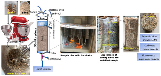 The designed materials and test setup for the MICP treatment are shown in Figure 5. The dried “Mikawa” sand (75 ± 5 g) was taken into a 50 mL standard syringe tube (diameter 3 cm, height 10 cm). In each case, oven-dried samples (as described earlier) were compacted into 3 layers by applying a hammer shock on each layer of the sand. A lab-grade filter paper was used to cover the bottom portion of each column. Each sand column was filled with consistently mixed jute fibers using an automatic mixer (kitchen aid 9KSM160 series), with different fiber lengths and contents used. To neutralize the electrostatic charge of fibers and sand grains, 10 mL of (DW) de-ionized water was added during the mixing process to ensure uniform distribution of fibers within the soil matrix.