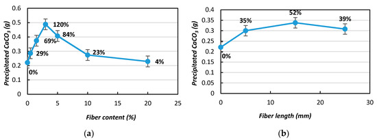 Figure 7b shows the amounts of CaCO3 precipitation with the same fiber content but variations in length (5, 15, and 25 mm, respectively). Figure 7b shows that the CaCO3 precipitation increased to 35%, 52%, and 39% with 3% fiber content and lengths of 5, 15, and 25 mm, respectively, compared to without addition. The variation in the CaCO3 precipitation amounts within the same set of samples was lower than when the fiber content was varied. The findings of this study indicate that the content (weight %) of the fiber addition is more important than the fiber length in the MICP treatment in order to promote the precipitation of CaCO3, which is in good agreement with previous studies [24,25].