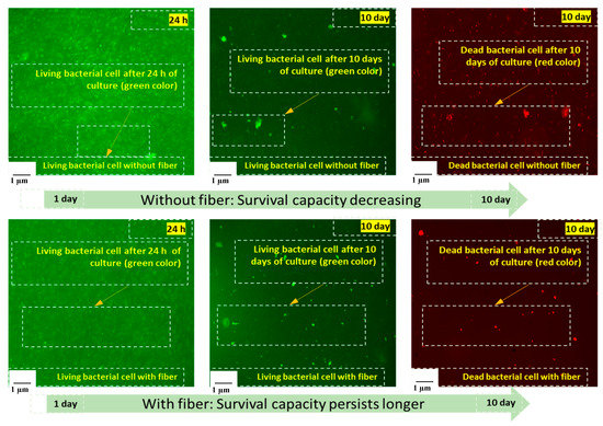 The fluorescence microscopic images of the cultured bacterial cells (with and without fibers) are shown in Figure 9. The images show that the bacterial survival capacity persists for longer with the addition of jute fibers. The number of dead bacterial cells was also reduced after 10 days of cultivation with the addition of the fibers. The action behind this characteristic is the availability of biopolymers (cellulose, hemicellulose, lignin, pectin, and waxy substances) in the jute fibers [30]. When jute fibers are steeped in water, the water-soluble carbohydrate compounds (D-glucosidic bonds and hydroxyl groups) and biopolymers are broken down into simple sugars (galactose) by a bio-chemical mechanism [31], acting as a source of nutrient for the bacteria, which is essential for the bacteria to survive for a longer time than usual. However, a further multidisciplinary assessment could be conducted to quantify this mechanism.