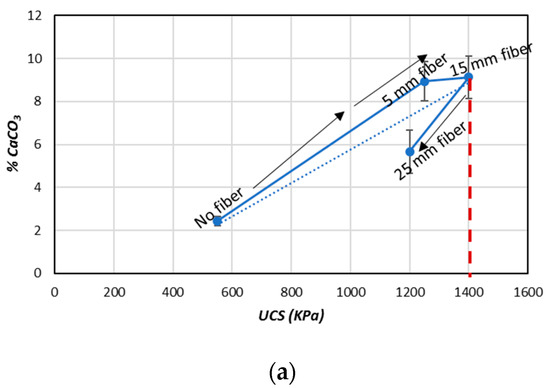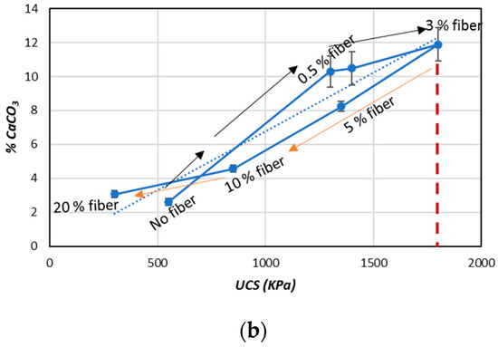 The relationship between the estimated UCS and the CaCO3 (%) from the results obtained in this study (considering the fiber length and content) is shown in Figure 11. By increasing the fiber length (5–15 mm), the CaCO3 (%) increased and the UCS also increased. The maximum UCS was observed with a 15 mm fiber length (Figure 11a). By further increasing the fiber length (25 mm), the CaCO3 (%) decreased and the UCS was dropped. In Figure 11b, it was also shown that the fiber content played a considerable role in the CaCO3 (%) precipitation process and also improved the UCS. With the increases of the fiber content (0.5–3%), the CaCO3 content also increased. As a result of the increasing CaCO3, the UCS values of the treated samples also increased until reaching the maximum point (approximately 1.6 MPa). Further increases of the fiber content (5–20%) caused the CaCO3 (%) precipitation and UCS of the treated samples to decrease [33,34]. The findings of this study clearly reveal that the fiber content (% weight) played a more significant role compared to the fiber length in terms of influencing the amount of CaCO3 precipitation and improving the UCS in the treated samples.