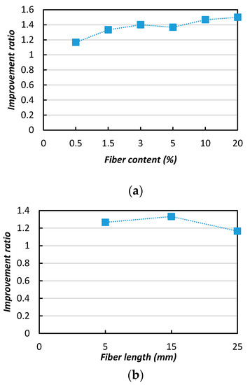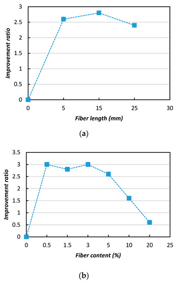 Figure 12 shows the effects of the fiber length on the soil’s strength improvement (UCS). In the Figure 12a, it can be observed that the improvement ratio (IR) increased from 2.5 to 3 with appropriate increases of the fiber length (5–15 mm), however with further length increases the IR value dropped and a negative influence was evident. In Figure 12b, it can be observed that the IR value was indicates the significant influence of the fiber content in the improvement of the soil strength. A relatively greater improvements were achieved with the 0.5 and 3% additions of natural jute fibers, with improvement ratios of 2.5 and 3.1, respectively.