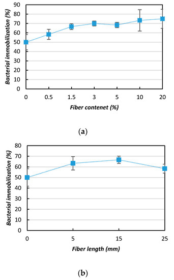 Influence of bacterial retention capacity with the addition of jute fibers: (a) fiber content; (b) fiber length.