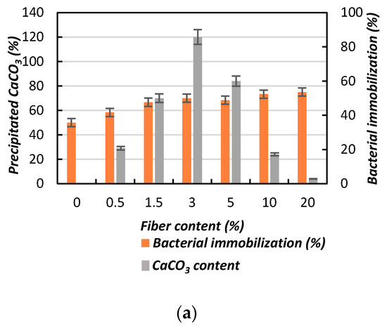 Figure 15 shows the effect of bacterial immobilization on the CaCO3 content with the addition of jute fibers, considering both the fiber content (Figure 15a) and fiber length (Figure 15b). Figure 15a shows that the CaCO3 content increased with increasing fiber content up to a certain amount. In this study, 3% fiber content result in the maximum amount of CaCO3 (Figure 15a). With further increases of the fiber content, the bacterial movement [31] became stuck (due to the fiber structure, as described earlier), resulting in decreased CaCO3 content within the soil matrix. A similar process was also observed when increasing the fiber length (Figure 15b).
