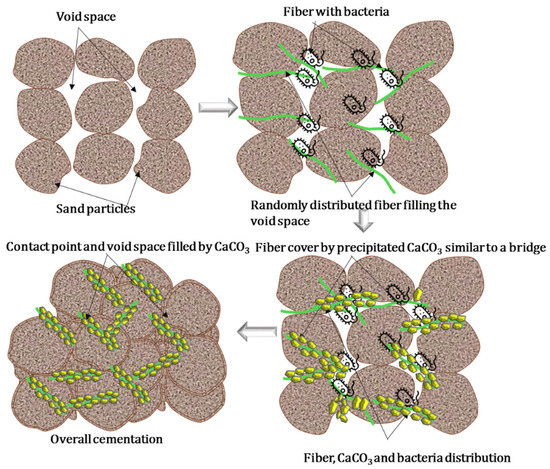 To improve this shortcoming, several studies have been conducted to improve the ductility and toughness of sand after MICP curing. Although sand solidified by microorganisms can reach a high strength, brittle failure of the substances mainly occurs and the strength is lost immediately, leading to safety hazards and problems. Therefore, the development of new mechanisms to improve the toughness, ductility, and durability of MICP-treated soil is a critical research need. The toughness, ductility, and durability of MICP-treated soil can be improved by the addition of fibrous materials. Earlier studies showed that using fibrous materials increased bacterial interactions with the cementation solution and facilitated uniform CaCO3 precipitation within the sand pores in MICP-treated soil [8]. Several studies have also revealed that the addition of fiber materials can substantially increase the engineering properties of MICP-treated soil (for example the shear strength, ductility, brittleness behavior, internal friction, and rigidity) [9]. However, to address these challenges, most of these previous studies focused on using synthetic-polymer-based fiber materials, such as non-woven geotextile fiber, steel fiber, polypropylene fiber, glass fiber, and carbon fiber, which are associated with relatively high costs, health concerns, and environmental hazards [10,11]. Moreover, to date, only a few experiments have concentrated on the improvement of the engineering properties of soils treated with the MICP method using fiber materials. Therefore, developing a new approach and identifying cheap, readily available fiber while considering safety, environmental considerations, and sustainability will require further investigations. A detailed analysis to improve the drawbacks of MICP-treated sand via the inclusion of fibers was inspired by the current deficiencies in the traditional MICP process.