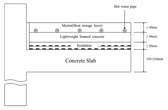 In the floor structure of a typical Korean house, cushioning or insulation materials (more than 20 mm) and lightweight foamed concrete (more than 40 mm) are placed on the concrete slab and then hot water pipes are installed, as shown in Figure 1. The heat storage layer (more than 40 mm) composed of sand and cement is then constructed on the top [21]. In this study, a certain proportion of cement was replaced with porous feldspar in the heat storage layer to increase the thermal efficiency of floor heating. Thermal, mechanical, and chemical methods were used for the activation of natural feldspar, and changes in the density, strength, and surface structure were observed. For the utilization of porous feldspar as a flooring material, it was mixed with cement and the strength characteristics were evaluated according to the mixing ratio. In addition, the thermal conductivity and heat storage characteristics were monitored through the test construction to evaluate porous feldspar as a substitute for cement.
