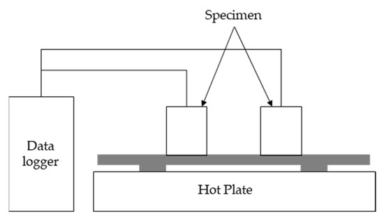 In the thermal diffusion and heat storage test, a temperature sensor was embedded at the center of 50 × 50 × 50 mm specimens, which were then subjected to water curing for 28 days [28]. The mixing proportions of the specimens were the same as those in EXP-FM1 and EXP-FM2, as shown in Table 5. The fabricated specimens were installed on top of a 400 × 400 mm hot plate, as shown in Figure 3. Their temperatures were measured every minute using a data logger. The test was conducted under two conditions. First, the temperature of the hot plate was set to 100 ℃ after installing the two specimens on top of the hot plate. Subsequently, the specimens were separated from the hot plate after a 60 min heating period. They were then cooled at room temperature (22–24 °C) to investigate their thermal diffusion effects and heat storage characteristics. In the second method, the thermal diffusion characteristics were investigated by repeating the heating and cooling periods to simulate conditions similar to those of the actual floor heating. Heating and cooling periods were repeated for 300 min at 30 min intervals.