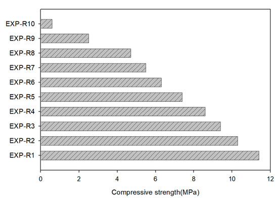 Figure 5 shows the uniaxial compressive strength according to the mixing ratio of cement and porous feldspar powder. The compressive strength of the specimen with only cement was 11.43 MPa, and the compressive strength decreased as the cement content decreased. The compressive strength linearly decreased for EXP-R10 to EXP-R4 in which the cement content was reduced to 40%, and it rapidly changed for EXP-R3 to EXP-R1 in which the cement content was less than 30%. This indicates that the proper mixing proportion of porous feldspar powder is less than 70% for a modest reduction in strength.