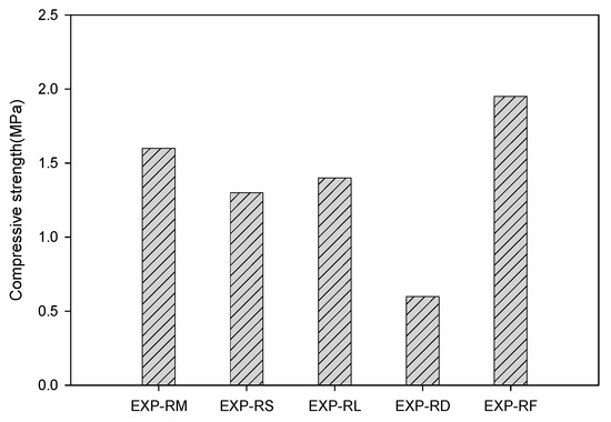 Industrial minerals that can be widely utilized as construction materials are clay minerals generated from weathered silicate minerals [23]. Among silicate minerals, silica fume, metakaolin, illite, and dolomite, which are representative pozzolanic materials containing a large amount of silica and alumina and are highly reactive with cement, were selected as substitutes for cement. When cement was replaced with porous feldspar, the compressive strength was compared with those of these materials (EXP-RM to EXP-RF). Five specimens were fabricated under each condition in accordance with KS L ISO 679, and the average compressive strength was used. After the fabricated specimens were cured at room temperature for three days, the uniaxial compressive strength was measured. Table 3 shows the mixing ratios of the materials under the above experimental conditions.
